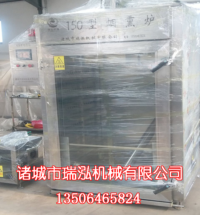 煙熏爐主要是由爐體、控制箱、發(fā)煙室三部分組成。爐體采用304部銹鋼制作而成,是進(jìn)行煙熏上色蒸煮烘干的場(chǎng)所,上部有風(fēng)扇、銅盤管,風(fēng)扇的作用是在電機(jī)的帶動(dòng)將吸上來的熱氣、煙霧進(jìn)行擴(kuò)散,達(dá)到均勻地效果,風(fēng)力循環(huán)越好,煙熏效果越好,產(chǎn)品品質(zhì)越好。銅盤管是用于烘干功能時(shí),蒸汽通過蒸汽預(yù)留口進(jìn)入銅盤管內(nèi),銅導(dǎo)熱性好,傳熱速度快,并且增大了接觸空間,升溫速度更快,高效節(jié)能。電加熱管在兩側(cè),升溫速度快,受熱均勻。兩個(gè)溫度探頭,一個(gè)測(cè)爐內(nèi)溫度一個(gè)測(cè)食品溫度,可以隨時(shí)觀察爐內(nèi)溫濕度。對(duì)爐內(nèi)的溫度進(jìn)行工藝的控制,外觀的幫助我們判斷產(chǎn)品的熟化狀態(tài)。爐內(nèi)兩側(cè)有獨(dú)立煙道,上部設(shè)有排氣口、排煙口,側(cè)面專門有蒸汽對(duì)流口,目的也是保證爐內(nèi)溫度、煙霧上下一致的效果,避免上下溫度不一致,煙熏色澤不一致的狀況。在爐內(nèi)的底部設(shè)有排水口,排除蒸汽遇冷凝結(jié)形成的水珠。并設(shè)有煙量可調(diào)風(fēng)門,過濾網(wǎng)可防止煙灰進(jìn)入管道。煙道管路短,污染少,拆洗方便。zui大限度優(yōu)化箱體內(nèi)部氣流循環(huán)狀態(tài),確保整個(gè)箱體物料加工過程中可控、均勻,達(dá)到了低耗、高效的產(chǎn)出。