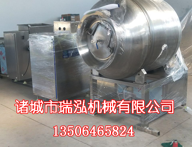 真空滾揉機(jī)轉(zhuǎn)速與方向:滾揉速度控制肉塊在滾揉機(jī)內(nèi)的下落能力。根據(jù)不同類型的產(chǎn)品,一般控制在8--12r/min。另外,滾揉機(jī)應(yīng)柔和地推擠、按摩、提升和摔落肉塊,以達(dá)到較好的滾揉效果。滾揉機(jī)的運(yùn)轉(zhuǎn)不要連續(xù)進(jìn)行,一般的方法是采取間歇滾揉的工藝,既讓設(shè)備運(yùn)行一段時(shí)間,再停一段時(shí)間,反復(fù)這樣運(yùn)行(中間讓肉餡“休息”),直至達(dá)到預(yù)期的滾揉效果。設(shè)備設(shè)有反轉(zhuǎn)功能,也可采取正—反—停間歇滾揉的工藝進(jìn)行,主要是為了避免由于摩擦而引起的肉溫上升,同時(shí)也使肉的結(jié)構(gòu)組織不容易受到破壞。