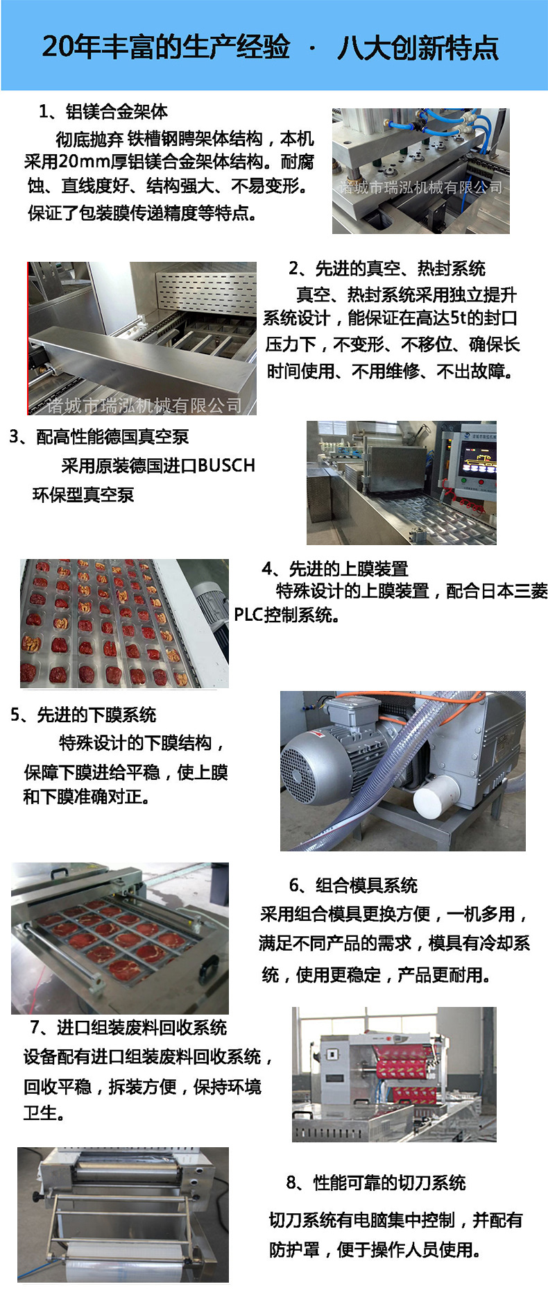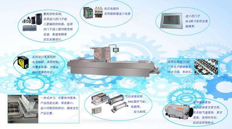 ◇全自動(dòng)真空包裝機(jī)上下分離式模具,強(qiáng)度高、耐腐蝕,設(shè)計(jì)更加合理。裝卸方便快捷。     ◇ 全自動(dòng)拉伸膜真空包裝機(jī)選用臺(tái)灣TYC或(意大利原裝REGINA)廣開式鏈條膜夾。保障夾持力度,傳動(dòng),使用壽命長(zhǎng)。     ◇全自動(dòng)拉伸膜真空包裝機(jī)采用獨(dú)立橫切,單刀可移動(dòng)調(diào)整。電腦集中控制,可在觸摸屏上選擇單刀開、關(guān)。     ◇選用德國(guó)原裝進(jìn)口BUSCH、LEYBOLD、Rietschle真空泵,具有抽氣速度快、真空度高、使用壽命長(zhǎng)等特點(diǎn)。     ◇全自動(dòng)拉伸膜真空包裝機(jī)采用進(jìn)口PanasonicMDME102GCG或(德國(guó)原裝SIEMENS--S110、S150)伺服高速、高走膜設(shè)計(jì)。     ◇ 全自動(dòng)真空包裝機(jī)配備進(jìn)口PanasonicLX-111或(美國(guó)原裝BANNER-R58)高靈敏三色標(biāo)光電傳感器,高精度定位每個(gè)圖案在產(chǎn)品的位置。美化產(chǎn)品外觀、提高產(chǎn)品檔次。     ◇溫度控制采用進(jìn)口PanasonicFCX-TC2或(德國(guó)原裝SIEMENS-S7-1200)智能控溫模塊??筛鶕?jù)產(chǎn)品要求在觸摸屏上設(shè)定溫度。     ◇全自動(dòng)真空包裝機(jī)架體采用一次擠壓成型鋁合金型具有強(qiáng)度高、耐腐蝕性好、不易變形等特點(diǎn)。     ◇ 全自動(dòng)拉伸膜真空包裝機(jī)選用日本原裝進(jìn)口SMC電磁閥、真空電磁閥。外形美觀、用氣量少、噪音低、經(jīng)久耐用,有效提高設(shè)備性能及使用壽命。     ◇全自動(dòng)拉伸膜真空包裝機(jī)廢料回收采用可調(diào)力矩電機(jī)系統(tǒng),使邊料回收更加清潔,方便且無(wú)噪音。     ◇全自動(dòng)真空包裝機(jī)上下膜均采用感應(yīng)式自動(dòng)剎車與漲緊系統(tǒng),并配有橫向調(diào)整手柄,隨時(shí)調(diào)整包裝膜的運(yùn)行方向。     ◇ 全自動(dòng)拉伸真空包裝機(jī)整機(jī)配有電力缺相、逆相、電壓過高、電壓過低、漏電保護(hù)系統(tǒng)、便于操作、調(diào)整。成型室、熱封室、橫切刀、縱切刀都安裝安全開關(guān)及防護(hù)罩,故障時(shí)自動(dòng)停車并顯示故障原因