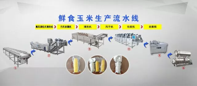 即食玉米速凍玉米鮮玉米粒加工工藝流程--去皮--挑選(切頭去尾)---清洗去雜去須---蒸煮殺菌---風(fēng)干瀝水---真空包裝---速凍(入庫)